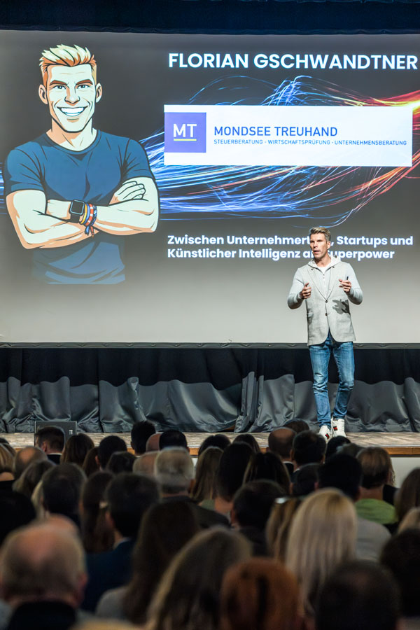 Gschwandtner berichtete wie KI-Technologien seine Unternehmensstrategie beeinflusst haben. Er schilderte, welche Rolle maschinelles Lernen und Big Data bei der Entwicklung neuer Produkte und Dienstleistungen spielen und wie KI die Effizienz und Individualisierung in allen Branchen und Märkten vorantreibt. Dabei betonte er, wie wichtig es ist, technologische Entwicklungen aktiv zu gestalten und nicht nur passiv zu beobachten, frei nach dem Motto raus aus der Komfortzone und rein in die Wachstumszone.